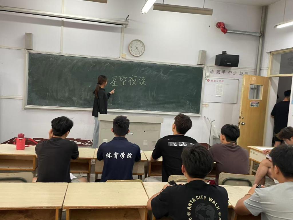 2025年7月9日晚,体育学院一间教室被暖黄灯光温柔笼罩。2023级舞蹈表演本科的同学们围坐成圈,“星空夜谈”心理健康活动悄然开启。黑板上的主题字泛着微光,暂时取代了训练的节奏,让年轻舞者们的心声在此自由流淌。