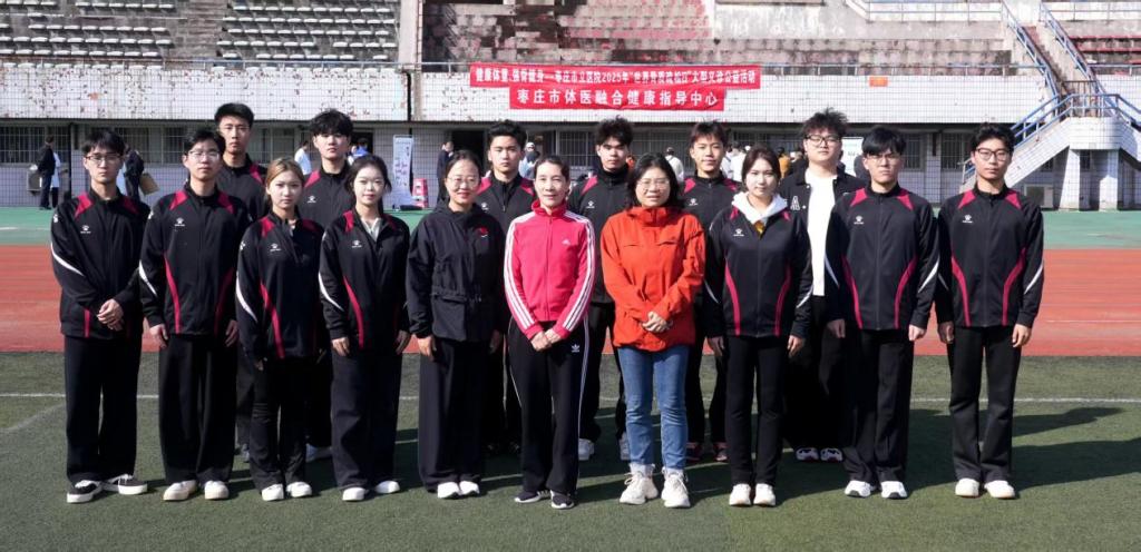 2025年10月19日,在2025年“世界骨质疏松日”来临之际,体育学院与枣庄市立医院在枣庄市体育中心运动场联合举办体医融合公益活动。枣庄学院体育学院、枣庄市立医院相关领导出席活动并发表讲话。